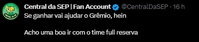 A postagem gerou reações inusitadas, com um gremista comentando: “Dia de ganhar”, e um torcedor colorado respondendo: “Para cima nada, entrega esse jogo”. Até mesmo um palmeirense sugeriu a utilização do time colorado completo reserva.