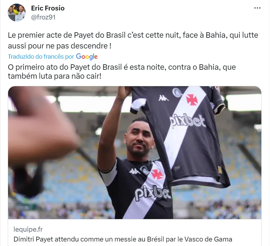 O jornal L’Équipe, da França, deu destaque no dia de hoje para a estreia do meia no Cruz-Maltino: “Dimitri Payet é esperado como messias no Brasil pelo Vasco da Gama. Com o Vasco da Gama, o ex-Marselha se tornará o primeiro francês a disputar o Campeonato Brasileiro, na Bahia. Mesmo que comece no banco, ele é esperado como o salvador”, disse o jornalista Eric Frosio, correspondente do periódico francês no Brasil.
