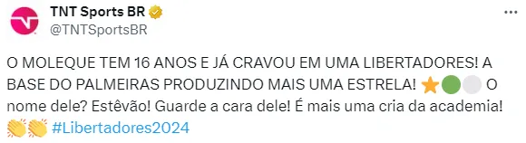 Quando se trata especificamente da Libertadores, Estêvão ocupa uma posição ainda mais destacada. Ele se tornou o segundo jogador mais jovem a marcar na competição, ficando atrás apenas de Endrick, que marcou aos 16 anos, 10 meses e 16 dias.