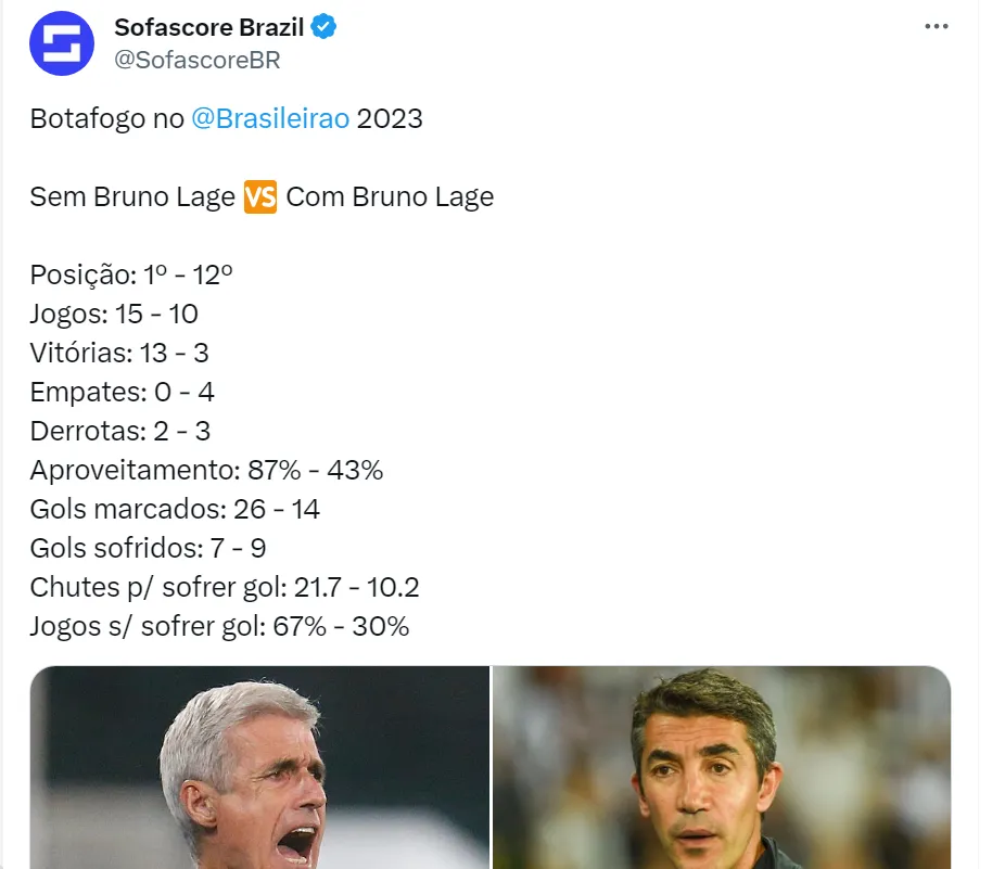 “Ele está fazendo o possível para o Botafogo perder o campeonato. Eu estou impressionado com a incompetência desse rapaz, é assustador. Ele está atrapalhando o Botafogo”, afirmou o treinador. Para efeito de comparação, de acordo com o Sofascore, Luís Castro deixou o Fogão com aproveitamento de 87% dos pontos no Brasileirão, enquanto Bruno Lage neste momento tem um aproveitamento na Série A de 43%.