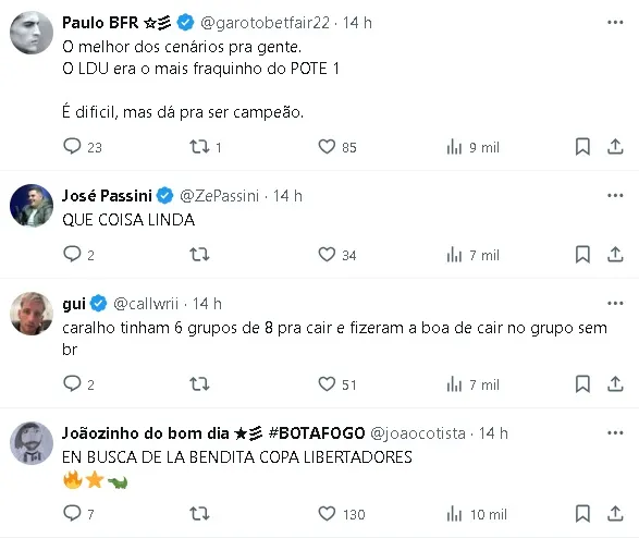 No returno, a ordem de jogos do Fogão é: LDU, em casa (7 a 9 de maio), Universitario, fora de casa (14 a 16 de maio) e Junior Barranquilla, fora de casa (28 a 30 de maio).