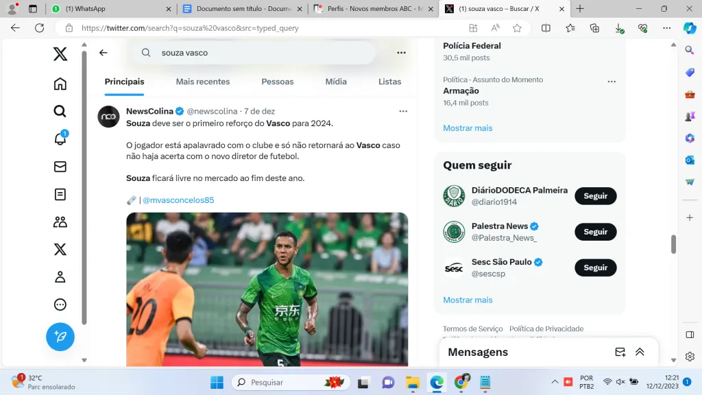 Quem está louco para retornar – e não é de hoje – é o volante Souza. Cria da Colina, o meio-campista já vem treinando no CT Moacyr Barbosa, em recuperação de lesão, e tem chances de ser o primeiro reforço da SAF cruz-maltina para 2024.