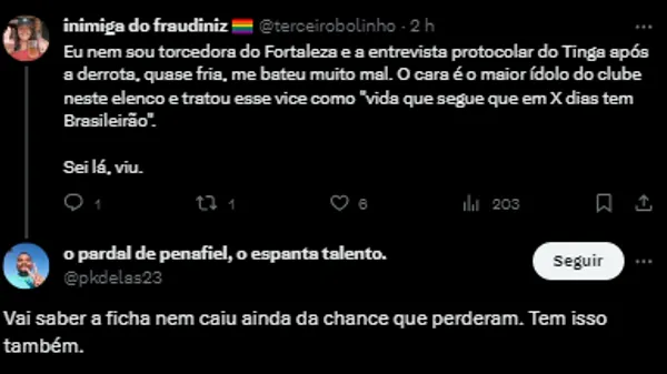 Apesar da derrota, Tinga ressaltou a necessidade de virar a página e concentrar-se na reta final do Campeonato Brasileiro. O jogador enfatizou a importância de manter os pés no chão e focar no trabalho passo a passo, já que a equipe tem mais dez jogos na competição nacional. Com duas derrotas consecutivas, o Fortaleza enfrentou um desafio no Brasileirão após a final da Sul-Americana.