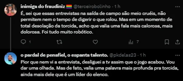 “A final é detalhe, foi nos pênaltis, fizemos um grande jogo, tivemos dificuldades, mas faz parte. Agradecer o torcedor por todo esse apoio, esse esforço, agora vai ter uma viagem longa para casa, que todo mundo volte bem. E que a gente também volte bem, porque quarta-feira já tem um jogo dificílimo de Campeonato Brasileiro”.