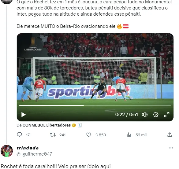Um dos grandes nomes que podemos citar que tem ajudado o Colorado a avançar na competição é o goleiro Sergio Rochet. Desde que assumiu o posto contra o River Plate, não perdeu mais a posição e se mostrou para o que veio. Em entrevista ao programa La Quinta Tribuna, da AUF TV, o jogador se mostrou surpreso com a recepção que recebeu dos torcedores colorados.