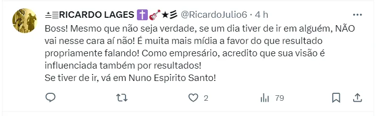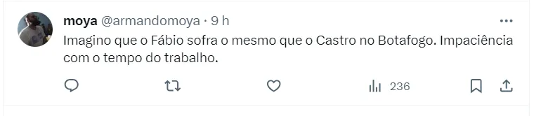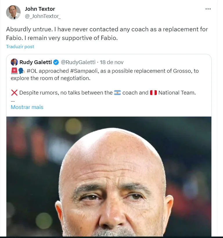 O argentino teve o nome vinculado ao Olympique de Lyon, da França. “Eu nunca contatei nenhum treinador para substituir Fabio. Eu continuo a apoiar Fabio”, afirmou Textor através de seu perfil oficial no X, antigo Twitter.