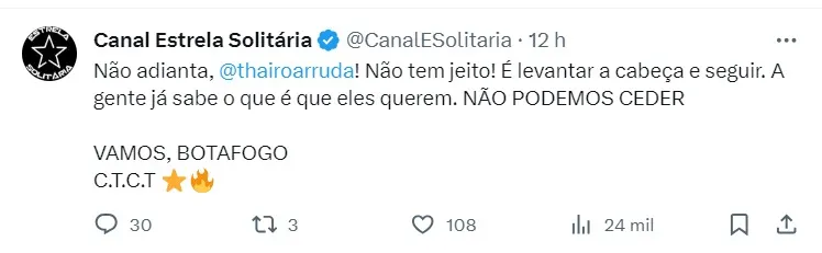 Através das redes sociais, o CEO do Botafogo, Thairo Arruda, criticou a validação do gol do Cuiabá, no confronto do último domingo (29). O mandatário reclamou de um toque de mão no lance do gol. Thairo ainda aproveitou para alfinetar o técnico Abel Ferreira, do Palmeiras, conhecido por ser crítico com a arbitragem nacional.