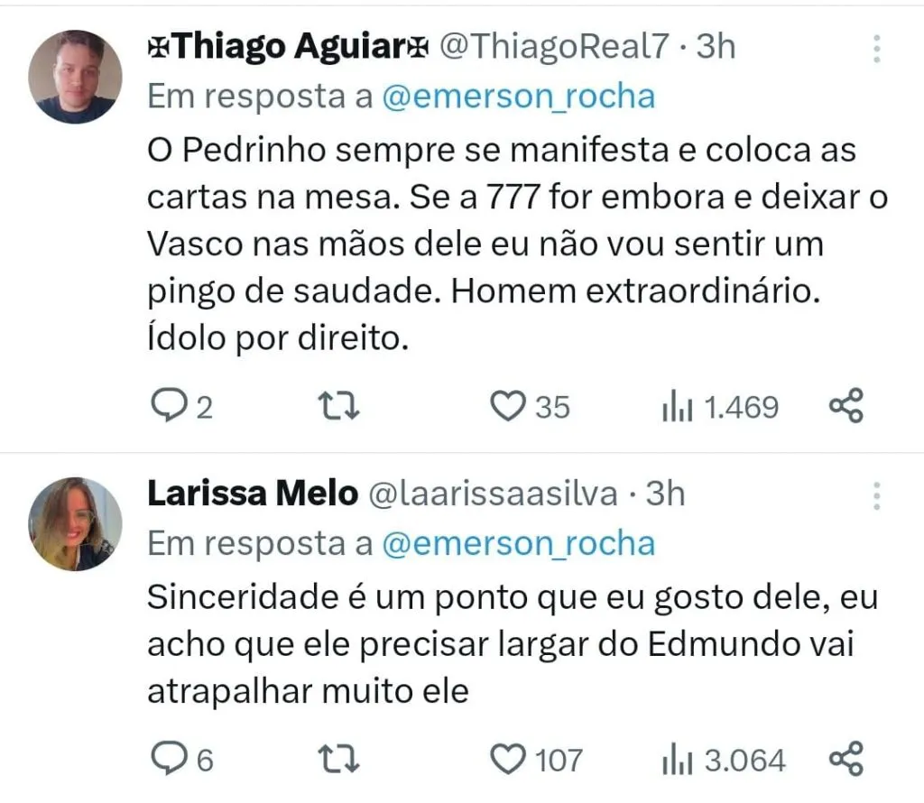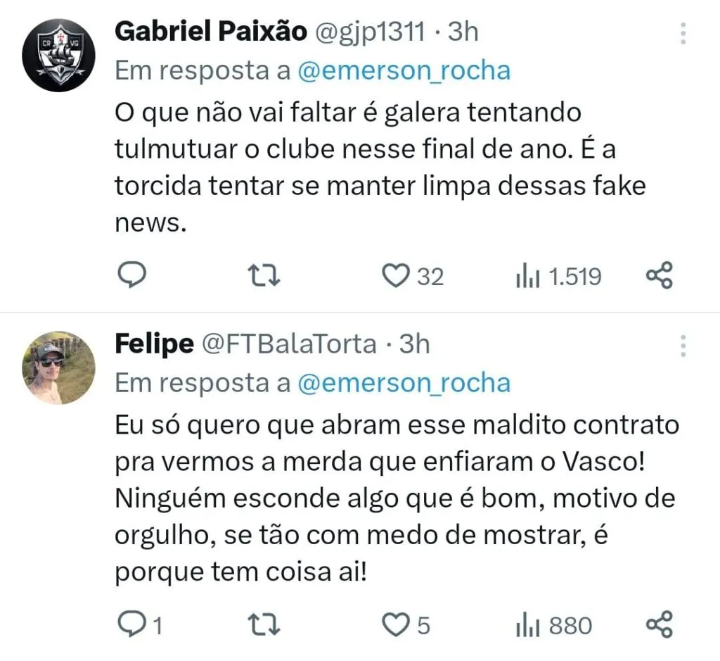 “Fala, torcedor vascaíno, tudo bem? Passando aqui para esclarecer um ponto com vocês. Saiu uma matéria hoje, e eu não fui consultado, e essa matéria não procede. Inclusive eu estava em uma reunião virtual, agora, com os dirigentes da 777.”, iniciou.