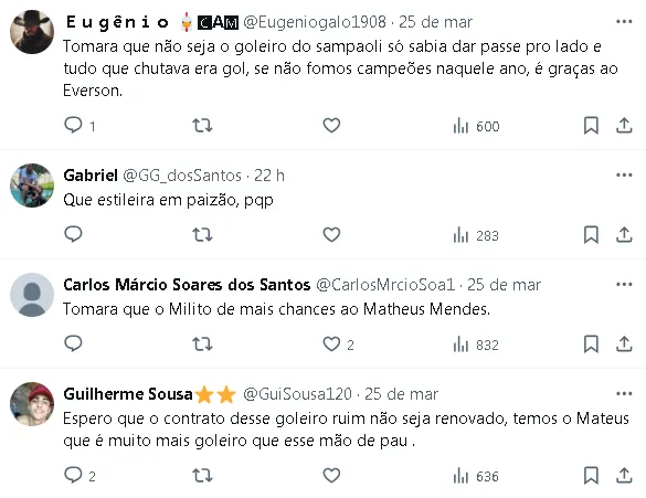 “Gostei, é uma escola que eu particularmente gosto de trabalhar, com treinadores argentinos. Vai ser o quarto que vou trabalhar junto. Que a gente possa fazer uma linda história aqui no Atlético e conquistar títulos que é o mais importante“, afirmou Everson, demonstrando otimismo em relação à parceria com Milito.