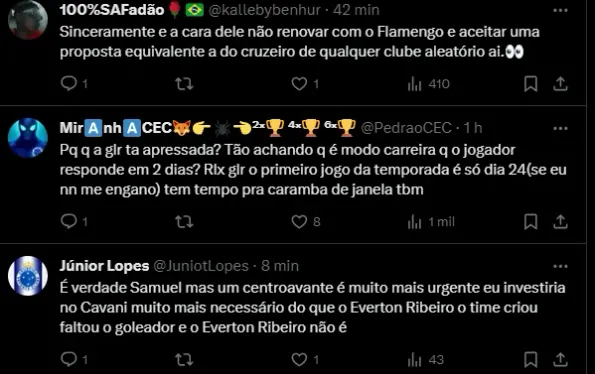 “Estou aproveitando minhas férias. Meu representante está conversando com o Flamengo e vamos ver da melhor maneira para seguir sendo vencedor no Flamengo”, disse Ribeiro.