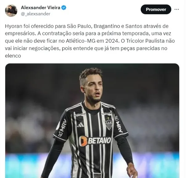 Segundo apurou a reportagem, o meia-atacante Hyoran, foi oferecido para o Grêmio. O jogador tem contrato somente até dezembro deste ano com o Atlético Mineiro e já foi avisado que seu vínculo não será estendido para a próxima temporada. Dessa forma, seus agentes estão buscando novas alternativas no mercado para que ele continue em alto nível no futebol brasileiro.