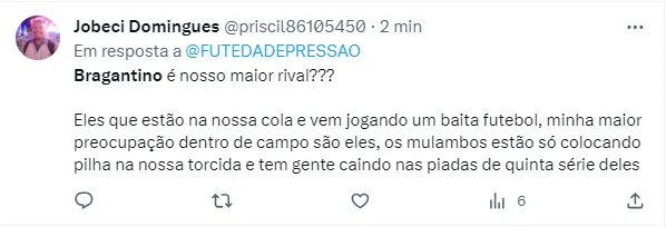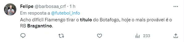 “Se fosse para apostar (em um candidato para tirar o título do Botafogo), vendo o rendimento das equipes hoje, eu vi o jogo do Bragantino, por exemplo, contra o Fluminense… criou, jogou alegre, joga bem, joga para frente, jogadores rápidos, jogadores leves, sem pressão. O Bragantino não tem pressão. Não tem uma grande torcida. Se fosse para apostar, pelo rendimento, eu apostaria no Bragantino”, conclui o Fabuloso.