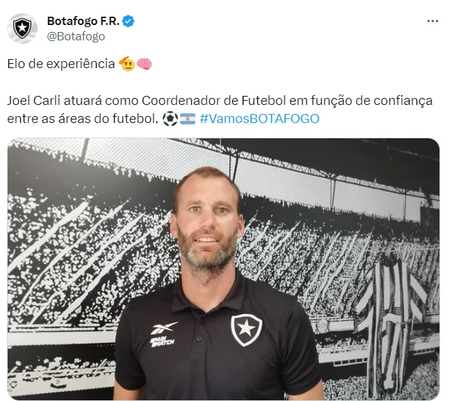 Mas uma situação que estava indefinida, e agora resolveu-se, era a do ex-zagueiro e ídolo do Botafogo, Joel Carli. Carli era auxiliar técnico de Lúcio Flávio, e com a saída do treinador, restaram dúvidas sobre quais seriam as funções de Carli no clube.