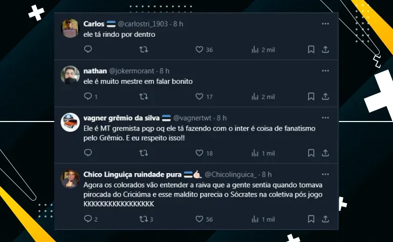 Isto é, muitos gremistas relembraram o fato do treinador sempre “enrolar” muito durante as coletivas, algo que foi apresentado aos colorados justamente após a eliminação marcante de ontem (23).