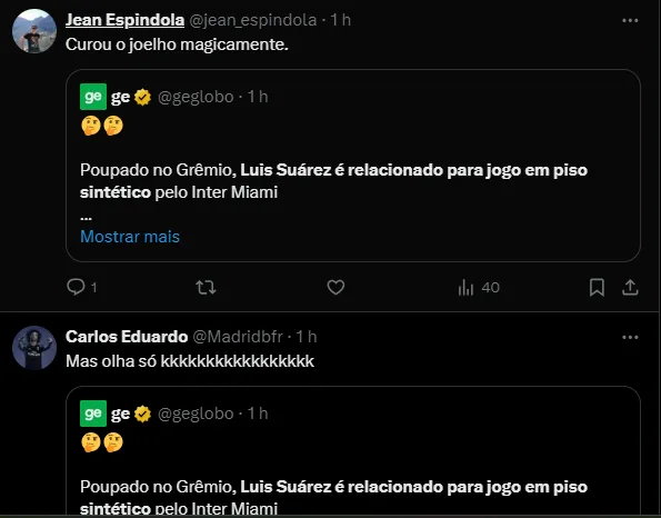 “O próprio Renato disse na época que o Suarez não queria e não gostava de jogar em sintético“, “E vocês acreditaram na historinha que o Renato contou pós jogo contra o Botafogo. Era óbvio que era mentira” e “Curou o joelho magicamente”, foram alguns comentários.