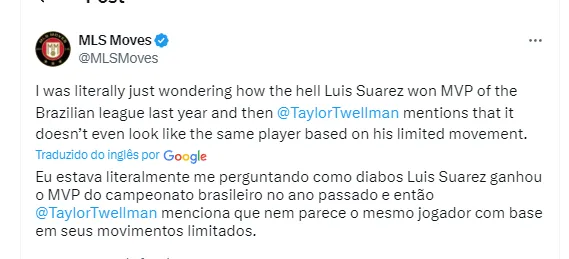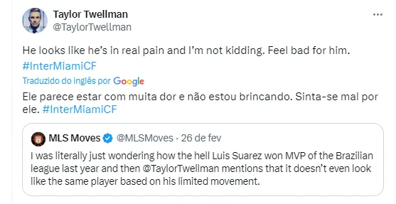 O comentarista da MLS, na Apple TV, e ex-jogador de futebol, Taylor Twellman foi honesto e direto ao falar do craque. Em sua análise, ele foi direto ao falar que claramente o centroavante não tem condições de jogar.