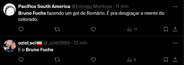 “Se ele faz esse gol em 2020 a ala Bruno Fuchs e Heitor do Twitter ia eclodir”, Bruno Fuchs decidindo clássico em MG e vocês aí com Mercado, Vitão e RDC (rei da cavada)”, e “Bruno Fuchs fazendo um gol de Romário. É pra desgraçar a mente do colorado”, foram alguns comentários.