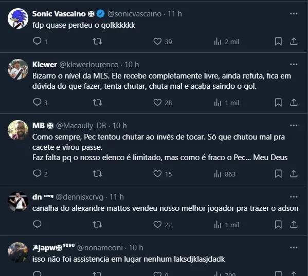 Entretanto, por mais que tenha colaborado com o gol e venha claramente fazendo falta ao Vasco, o torcedor brincou com o fato de Pec ter tentado chutar no lance da assistência. Ele recebeu livre pela esquerda, entrou na área e viu o chute parar no companheiro. O tema repercutiu bastante entre os vascaínos.