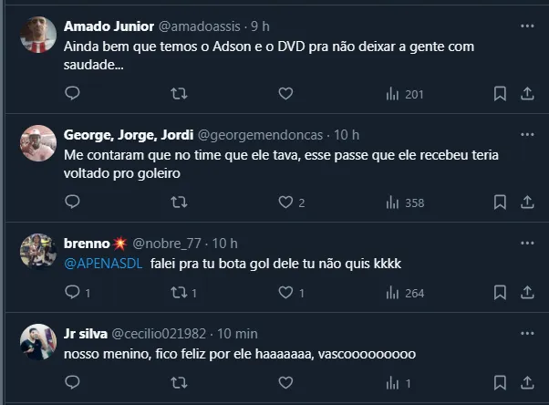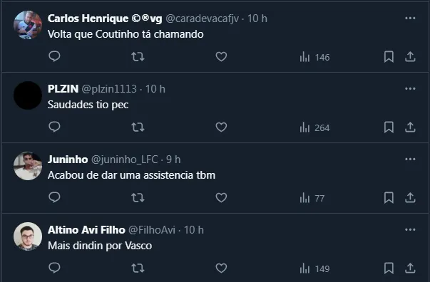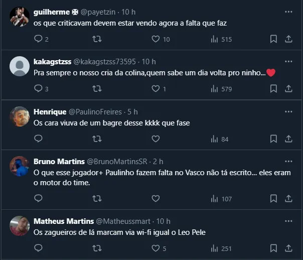 Não à toa, o assunto trouxe inúmeros tipos de comentário, desde alguns desmerecendo o atleta, até outros lamentando sua saída. O Vasco enfrenta o Cruzeiro hoje (16), às 18h30, em São Januário.