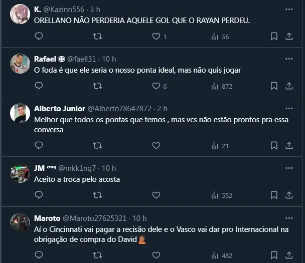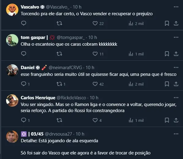 Desse modo, o assunto virou tema de discussão entre torcedores do Vasco, que pediram sua volta e o compararam com alguns dos nomes do elenco atual. Aos 24 anos, seu vínculo com o clube americano vai até dezembro de 2024.