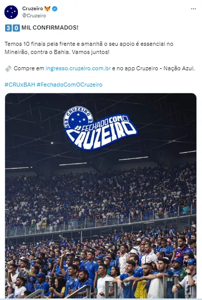 E o jogo desta quarta-feira, válido pela 29ª rodada do Campeonato Brasileiro, será contra o Bahia no estádio do Mineirão, às 20h (horário de Brasília). E a expectativa é de casa cheia, pois até à tarde desta terça-feira (24), mais de 30 mil ingressos já haviam sido vendidos para a torcida celeste.