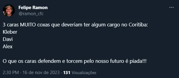 Nesta semana, por exemplo, Alex, ex-meia e atual treinador, deu uma declaração interessante para os torcedores do Coxa. Ao ser questionado em entrevista à rádio Jovem Pan, ele revelou que jamais aceitaria um convite do Furacão: