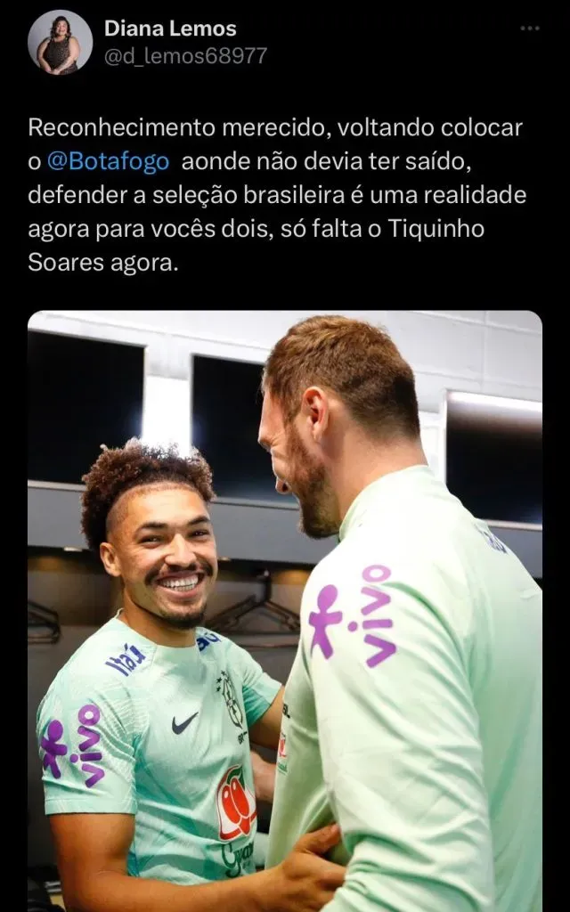 “Chega a arrepiar a pele. Estão fazendo um trabalho muito bom e mereciam a oportunidade. Acho que daqui a pouco (a convocação) vai chegar para o Tiquinho, porque ele merece muito isso. É muita emoção não só para mim, mas para todo o time. Quando o Adryelson voltar vou dar uns tapas nele (risos)”, afirmou o lateral em entrevista à BotafogoTV.