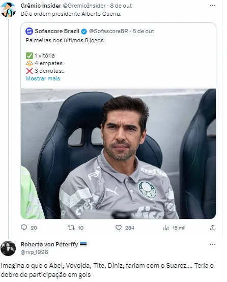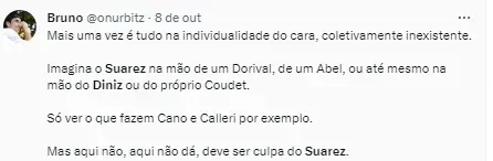 “O que eu posso falar em relação ao Suárez é que é um jogador esplendoroso, talvez um dos maiores ídolos da história do futebol uruguaio. O futebol brasileiro está tendo a alegria de poder acompanhá-lo de perto. Ele está jogando muito bem até hoje no Grêmio”, declarou Diniz, em entrevista coletiva, analisado o experiente atacante uruguaio que está no Tricolor Gaúcho.