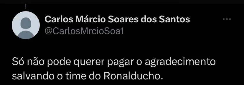 “Sempre será toda minha vida de agradecimento e de alegria ao Ronaldo, porque ele me deu uma das grandes alegrias nesse mundo, que foi ganhar aquele título juntos”, disse. Felipão ainda revelou que não imagina que veria Ronaldo seguindo o caminho de gestor. Ele ainda declarou que deseja ter um encontro com o dono do rival do Galo.