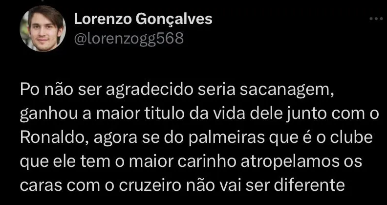“Não sei como vai ser enfrentá-lo. Estou pelo Atlético, sou profissional. Foi difícil ganhar do Palmeiras, clube que adoro. O Ronaldo vai fazer o dele lá. Tomara que a gente se encontre para bater um papo qualquer. Vamos ver o que vai acontecer. Seremos adversários em campo, mas fora do campo nunca. Nunca pensei que o Ronaldo seria diretor, eu não tinha essa imagem dele. Mas se tornou um diretor, dono de um clube, sabedor do que são suas prioridades”, comentou. “Vamos trabalhar um contra o outro. Nesse mundo de hoje, com coisas horríveis, futebol é jogo dentro de campo. Fora de campo é amizade, carinho, amor. É isso que sinto pelo Ronaldo”, finalizou.