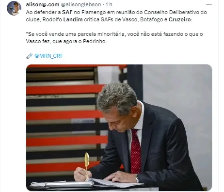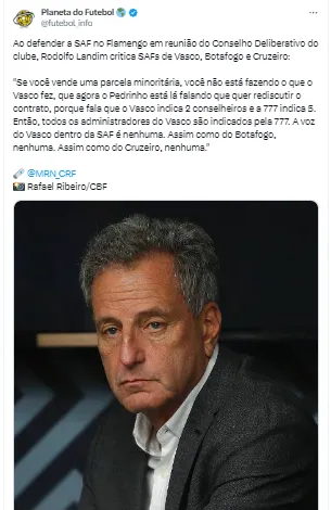 Segundo matéria publicada no site da Rádio Itatiaia, em reunião com os conselheiros do Flamengo, Rodolfo Landim, presidente do Rubro-Negro Carioca, se manifestou sobre a SAF do Cruzeiro e de seus dois rivais cariocas, Botafogo e Vasco.