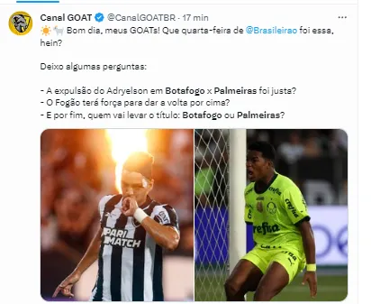 “O Botafogo tem tudo para ser campeão, mas o Palmeiras nunca vai deixar de correr atrás. Uma coisa que ficou entalada em mim, foi que os torcedores deles gritaram ‘é campeão’ ali no aquecimento”, afirmou Endrick.