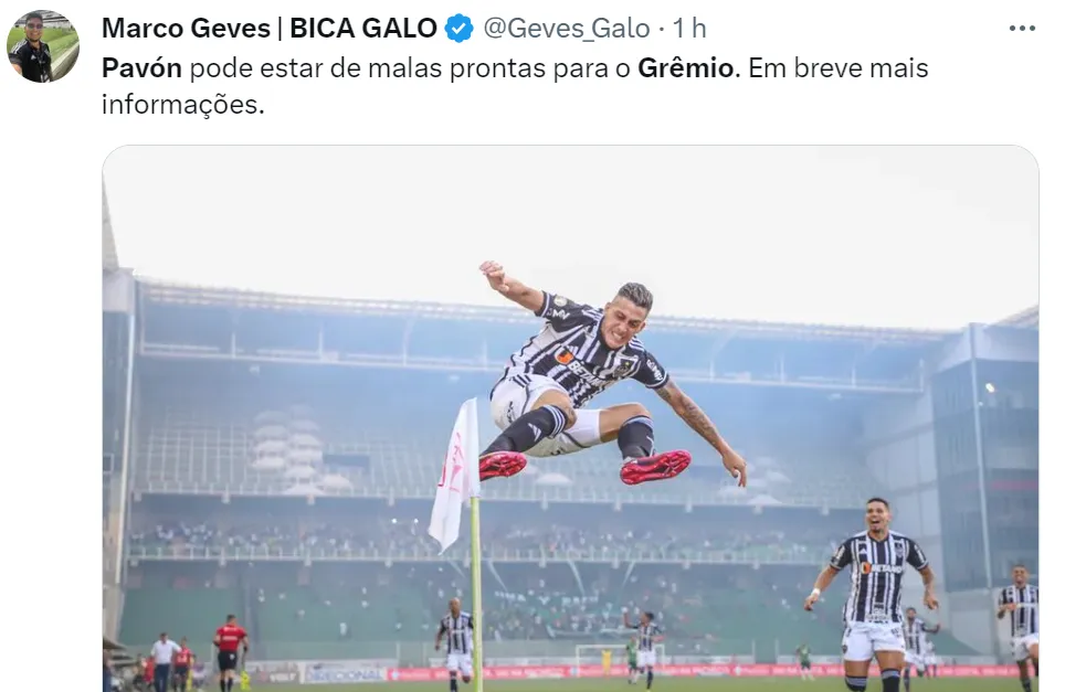 O setorista do Atlético-MG foi além na apuração: Pavón está fechado com o Grêmio por uma negociação em definitivo. Os valores ainda são mantidos em sigilo, porém se trata de uma oportunidade de mercado observada pelo departamento de Scout tricolor.