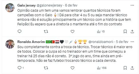 “Nós vamos fazer o que estamos fazendo. São três jogos, 20 dias de treinos. Nós sabemos que não é o início, mas sim a chegada que vai dizer alguma coisa. Nós temos que continuar trabalhando dentro do que estamos trabalhando. É isso que nós vamos fazer”, iniciou o comandante do Galo.
