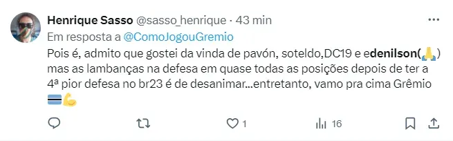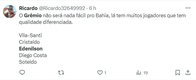 “Eu quero que a torcida gremista o receba (Edenílson) muito bem, ele tenta muito, sempre tenta jogadas inteligentes. O Grêmio fez um grande negócio contratando o Edenílson”, disse.
