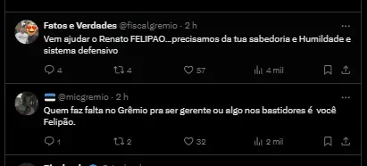 “É claro que eu não sirvo para dar conselhos a ninguém, nem Renato e nem a direção, mas o Edenilson, se eu fosse trabalhar no Grêmio, eu diria que ele faz falta ao Grêmio. Gostaria de ter, em todos os times que eu dirigir”, finalizou.