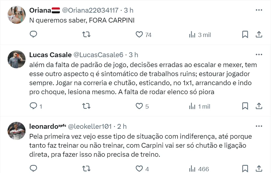 Com a eliminação do São Paulo no Campeonato Paulista, a pressão contra Thiago Carpini cresceu e a torcida fez muitas críticas ao treinador. O profissional foi chamado de “burro” no jogo diante do Novorizontino.
