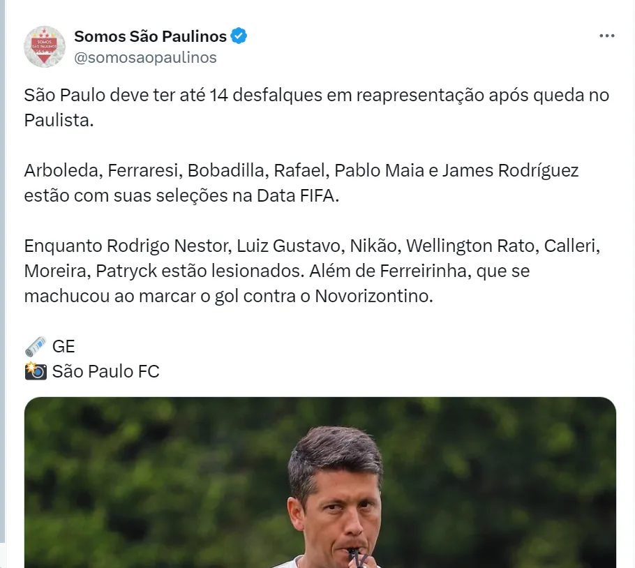“Felipão virará agora uma grande sombra para Thiago Carpini no São Paulo? Pela falta de opções no mercado, eu sinto que sim!”, escreveu o jornalista no UOL Esporte. O treinador tem vínculo com o Tricolor até o fim do ano.