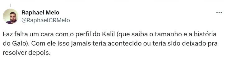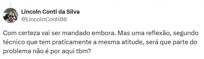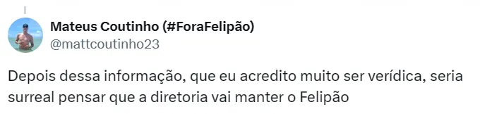 “Pós coletiva do Felipão, domingo, contra o América, ele entrou no vestiário e deu uma surtada. Com palavras ofensivas à torcida e a próprio instituição. Segundo informações, Sérgio Coelho não estava mais no vestiário, mas acredito que isso tenha chegado à cúpula atleticana. Quem estava presente, ficou assustado”, contou Domenico.