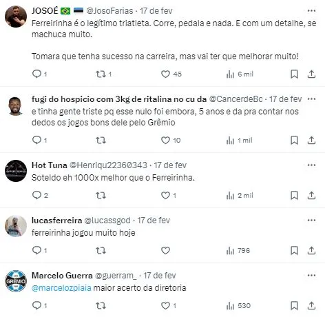 “Ferreirinha é o legítimo triatleta. Corre, pedala e nada. E com um detalhe, se machuca muito. Tomara que tenha sucesso na carreira, mas vai ter que melhorar muito!”, escreveu um torcedor na postagem do perfil Soccer News Grêmio.