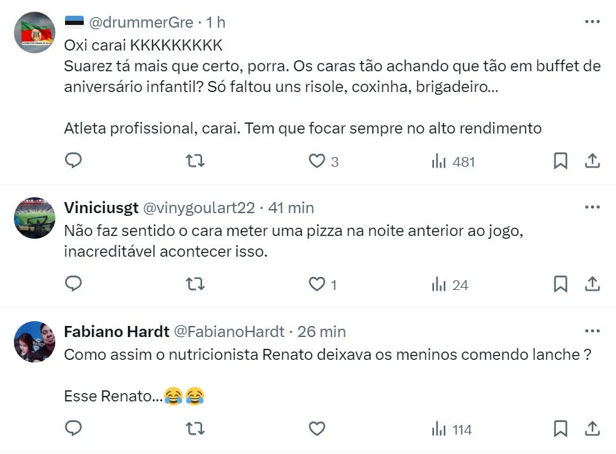 Durante o programa Resenha, da ESPN, Ferreirinha revelou uma normal que Suárez impôs no Grêmio: “É um cara extremamente profissional e tirou nosso lanche da concentração”, iniciou o jogador do São Paulo.