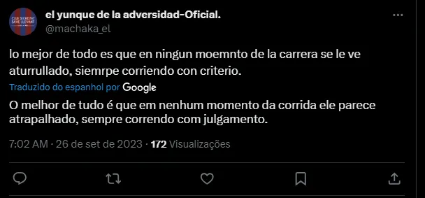 “Faltam 2 anos para a venda por 50 milhões e adeus dívida”, “O melhor de tudo é que em nenhum momento da corrida ele parece atrapalhado” e “Se me disserem que esse cara usa doping, eu acredito”, foram alguns dos comentários nas últimas partidas do jogador, que estava no Brasil de Pelotas antes de ser comprado pelo Grêmio para jogar na base, mas não teve chances no elenco profissional.