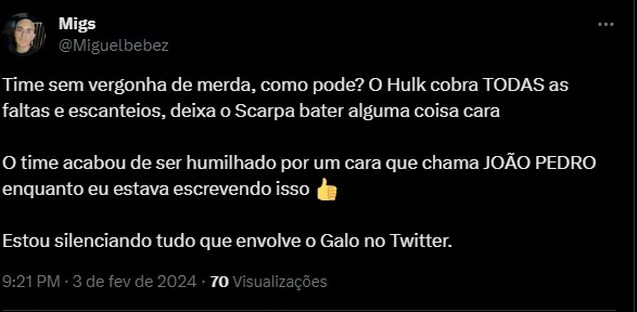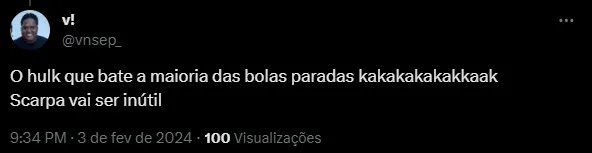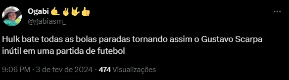 “Galo contratou o Scarpa pra que se o Hulk bate todas as bolas e escanteios?“, “Hulk bate todas as bolas paradas tornando assim o Gustavo Scarpa inútil em uma partida de futebol” e “O Hulk cobra TODAS as faltas e escanteios, deixa o Scarpa bater alguma coisa cara“, foram alguns comentários.