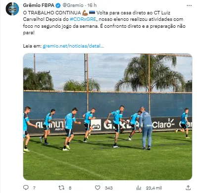 O Grêmio vem de um momento bom no Campeonato Brasileiro. A equipe empatou em 4 a 4 diante do Corinthians na última rodada, na Neo Química, em partida polêmica envolvendo a arbitragem, que a equipe gaúcha reclamou, porém na tabela a situação é boa. O time está na quarta posição com 40 pontos, mesmo que tenha visto o Red Bull Bragantino subir na tabela.