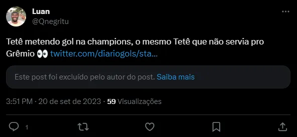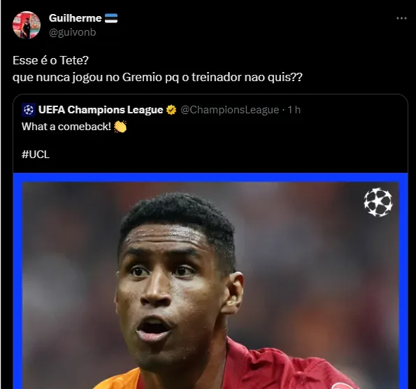 “Esse é o Tetê? Que nunca jogou no Gremio porque o treinador não quis??”, “Tetê metendo gol na champions, o mesmo Tetê que não servia pro Grêmio” e “Por onde andam os craques Kaio e Vico, prioridades na ordem de hierarquia do professor? Hahahahaha ta louco… Tetê não teve espaço…”, foram alguns dos comentários.