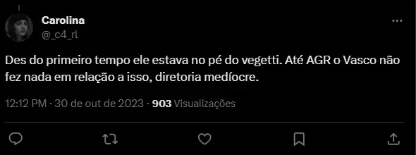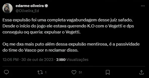 Um dia depois da partida, ou seja, nesta segunda-feira (30), Vegetti utilizou as redes sociais para repostar o lance da expulsão e desabafar contra a arbitragem de Flavio Rodrigues de Souza.