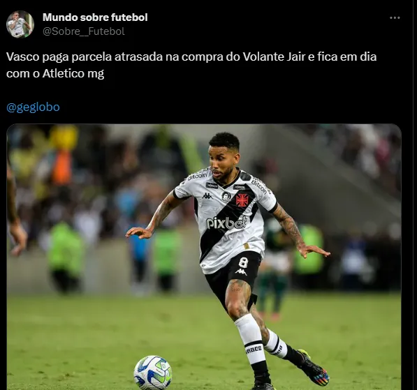 Uma delas é sobre a compra do volante Jair, que estava no Atlético-MG. O Vasco pagou nesta semana aproximadamente US$ 658 mil (cerca de R$ 3,32 milhões) ao Galo e quitou a parcela que estava atrasada. A informação é o jornalista Fábio Torres. Inclusive, o clube mineiro acionou o Gigante da Colina na Câmara Nacional de Resolução de Disputas (CNRD) da CBF, o que poderia acarretar em punição.