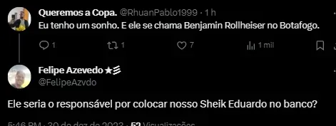 Segundo Matheus Medeiros, o Botafogo consultou os representantes de Rollheiser, mas foi informado de que a preferência do jogador é pela Europa. Clubes ingleses, como Newcastle, Brighton e Nottingham Forest, também foram mencionados como possíveis destinos.