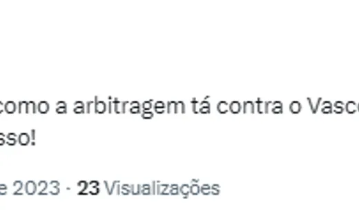 “Se continuar nesses roubos por parte da arbitragem, obviamente o Vasco vai ser rebaixado…”, “E mais uma vez o Vasco vai sendo derrotado com um erro de arbitragem contra, quem diria.”, “O Tanto que o Vasco é prejudicado pela arbitragem é sacanagem”, “Inacreditável o que a arbitragem fez com o Vasco hoje”, “Que arbitragem criminosa em Palmeiras e Vasco” , “A arbitragem se esforça pra f* o Vasco de uma maneira surreal.”, Já é o quarto jogo seguido que a arbitragem fica de p* com o Vasco”, “Pô cara eu já começa a achar que é perseguição, é bizarro arbitragem com o Vasco”, “A favor do Vasco não existe nada, contra o Vasco existe TUDO. Parece que a arbitragem faz questão de prejudicar”, foram algumas publicações no Twitter.