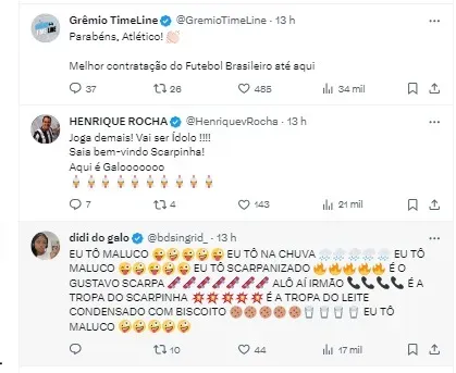 “Fala Massa Atleticana! To aqui para dizer será uma honra vestir a camisa do Galo, estou muito feliz com essa oportunidade, espero encontrá-los em breve, muito obrigado pelo carinho e pelo apoio nas redes sociais. É isso aí, estou chegando”, disse Scarpa em vídeo.